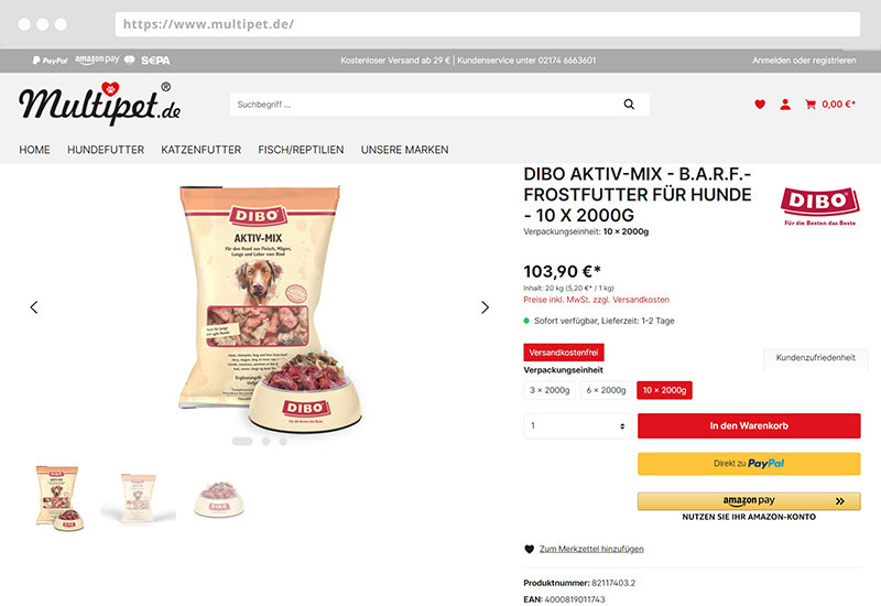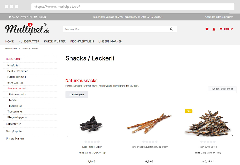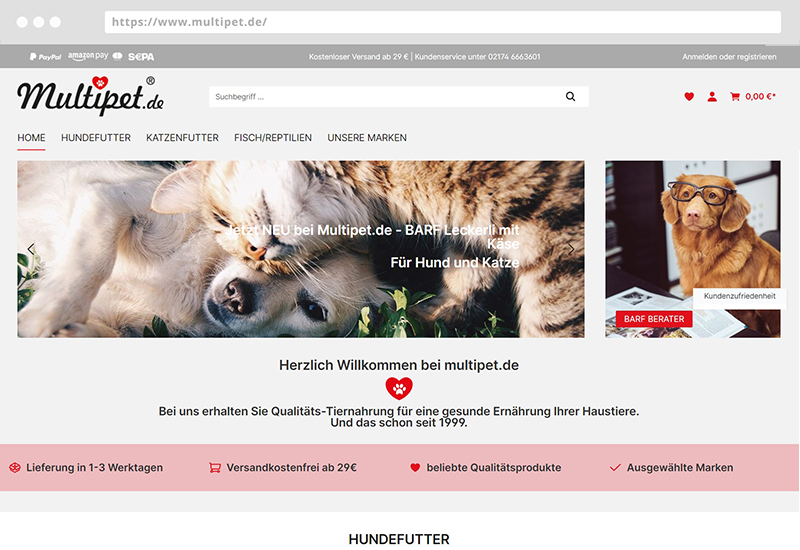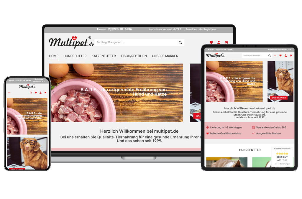 Für Multipet haben wir ein Shopware-Upgrade durchgeführt und betreuen den Kunden im Betrieb des Onlineshops.